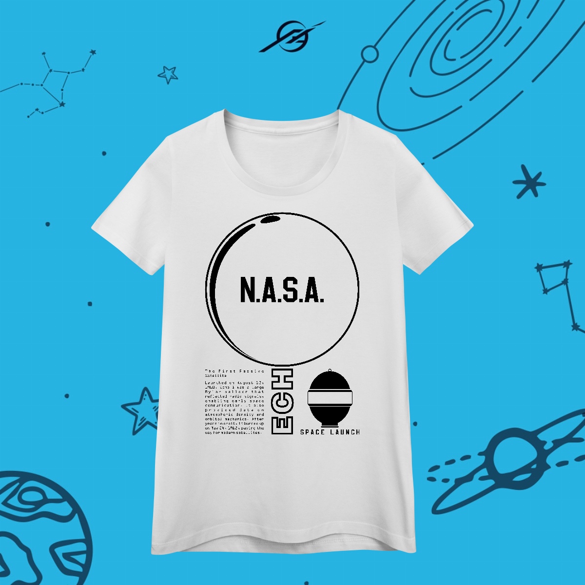 O satélite Echo foi um dos primeiros experimentos de comunicação espacial, uma gigantesca esfera reflexiva que permitiu testar transmissões entre continentes. Flutuando como um espelho no céu, ele simbolizou o início da era das telecomunicações globais. Esta estampa representa o poder da conexão, porque explorar o espaço também é encurtar distâncias aqui na Terra.