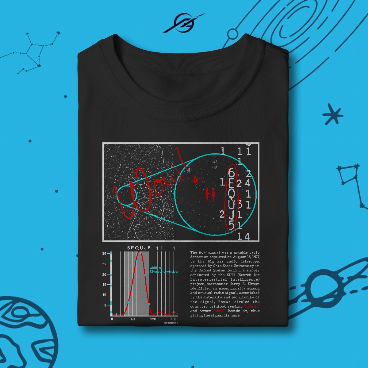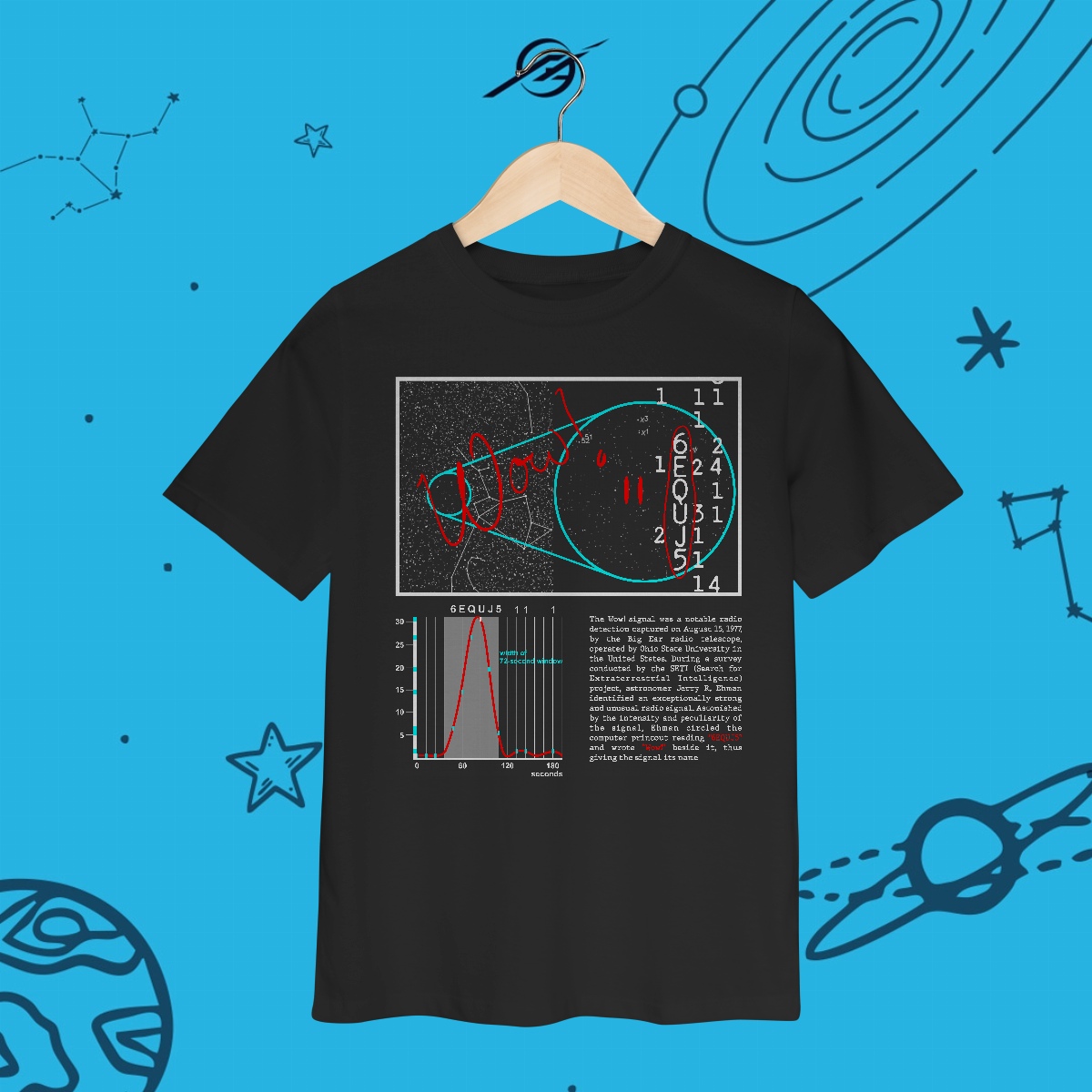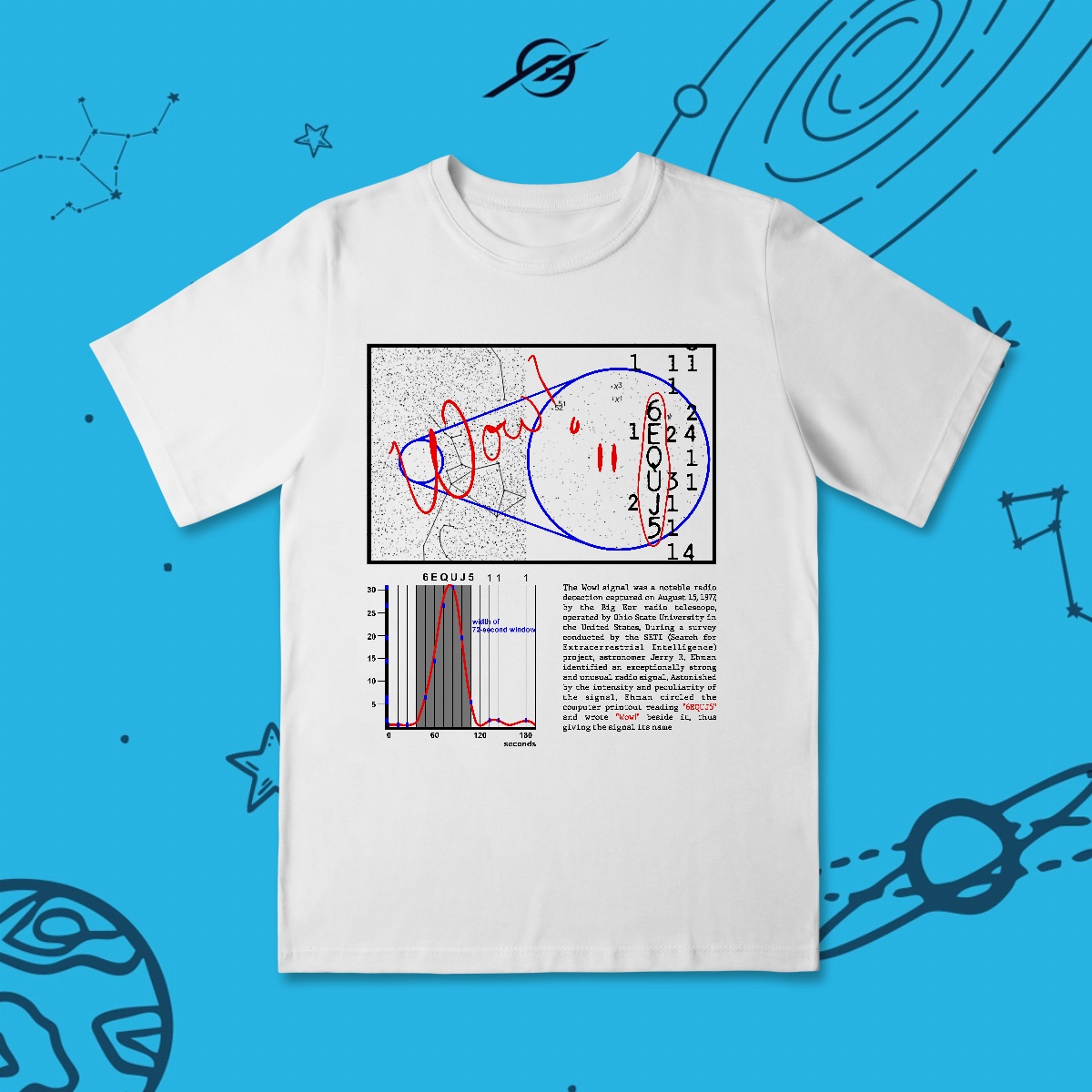O "Sinal Wow!" é uma misteriosa transmissão de rádio captada em 1977, que permanece até hoje sem explicação. Talvez um eco distante de inteligência extraterrestre, ou apenas um fenômeno desconhecido. Esta estampa simboliza a busca por respostas, porque no "Wow!" do desconhecido, somos lembrados de que o universo está cheio de sinais esperando para serem decifrados.