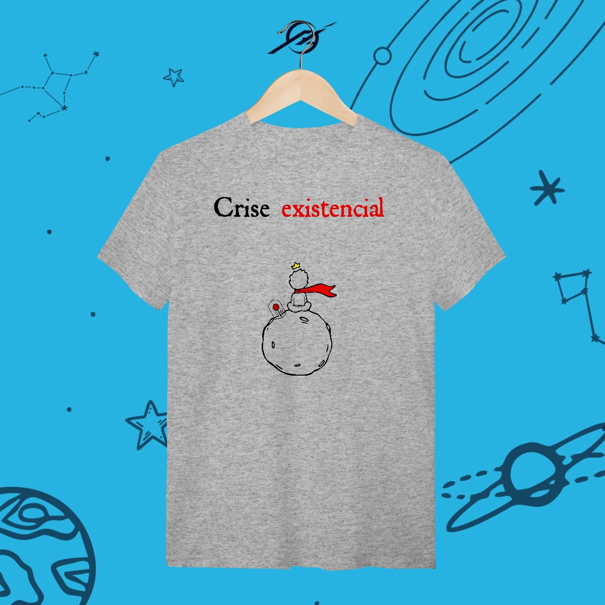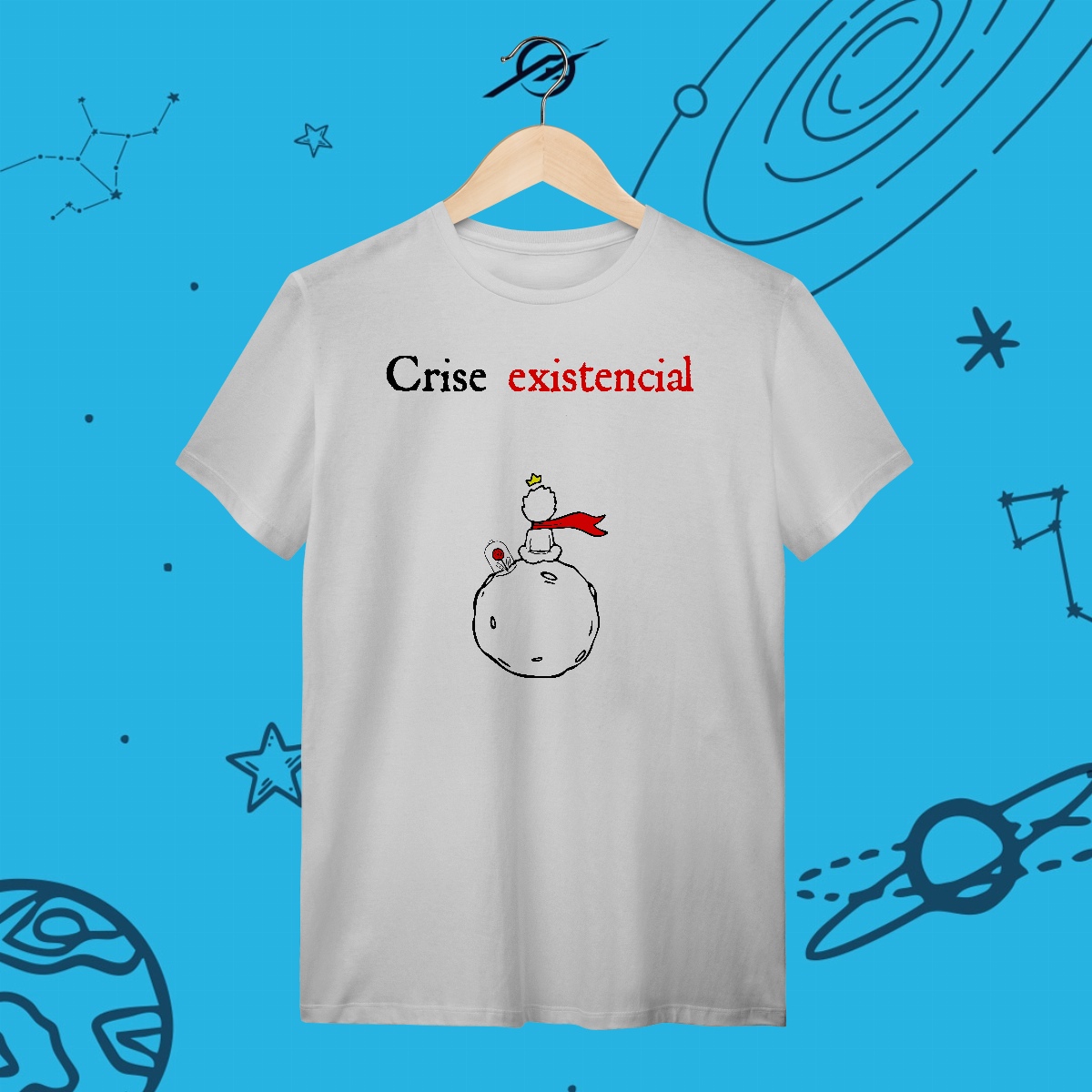 O que somos no imenso universo? Perdidos entre estrelas, buscamos significado em meio ao infinito. Como o Pequeno Príncipe, questionamos, exploramos e tentamos entender nosso lugar na imensidão. Esta estampa representa a beleza da dúvida, porque é nela que encontramos as perguntas que nos fazem crescer.