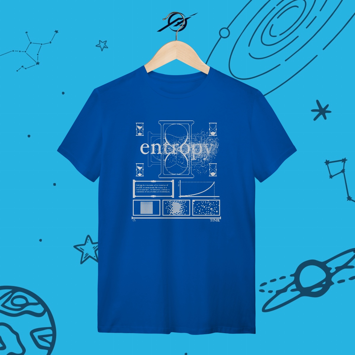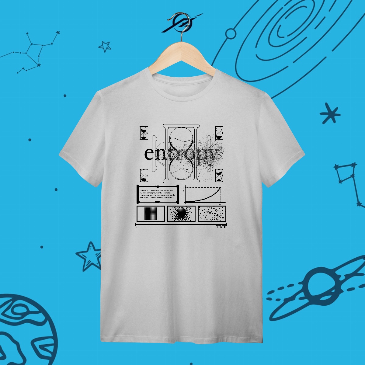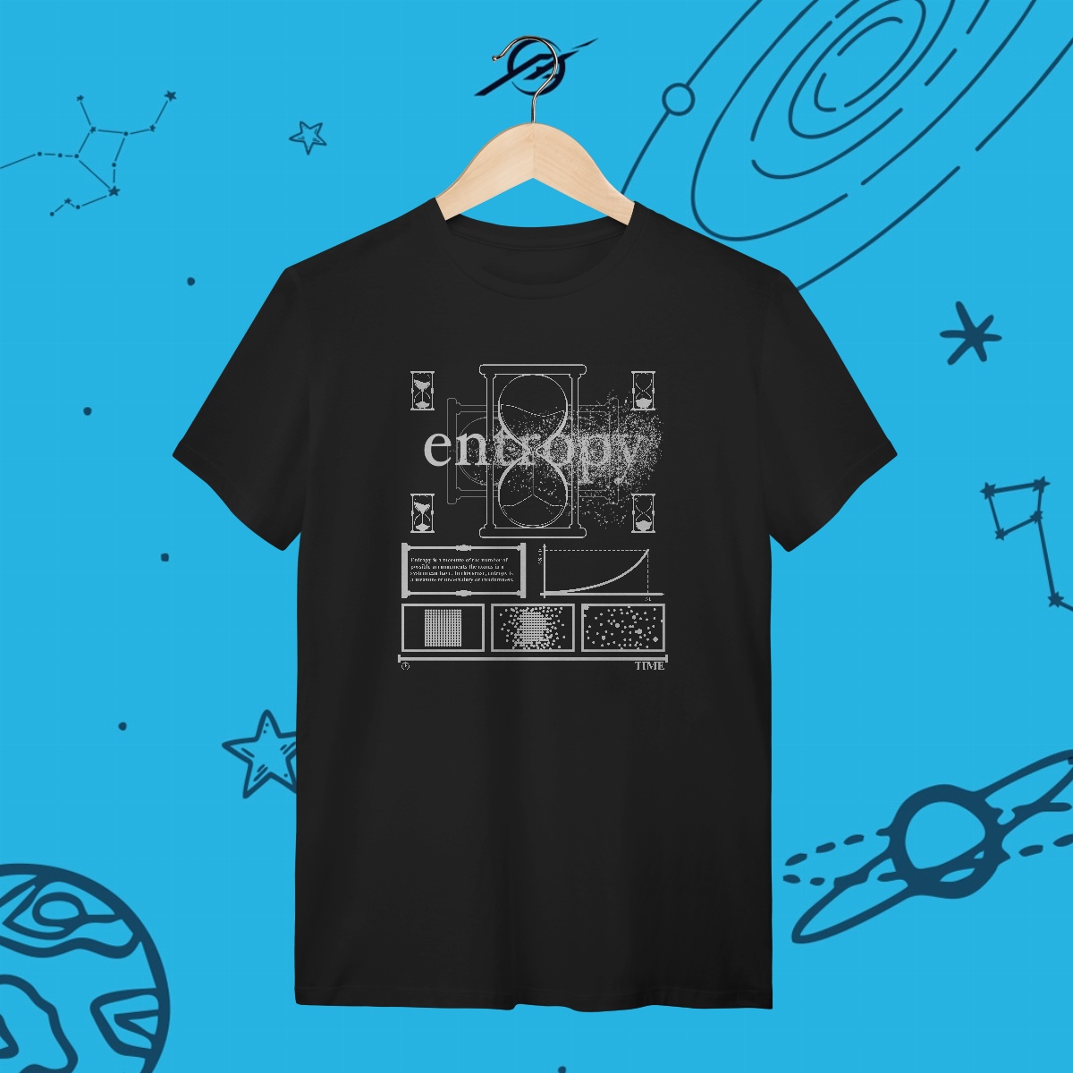 A entropia é a seta do tempo, guiando o universo do ordenado ao caótico, do previsível ao desconhecido. Das estrelas em colapso ao calor se dissipando, tudo está em constante transformação. Esta estampa representa a beleza do inevitável, lembrando que até na desordem há espaço para novas descobertas e possibilidades.