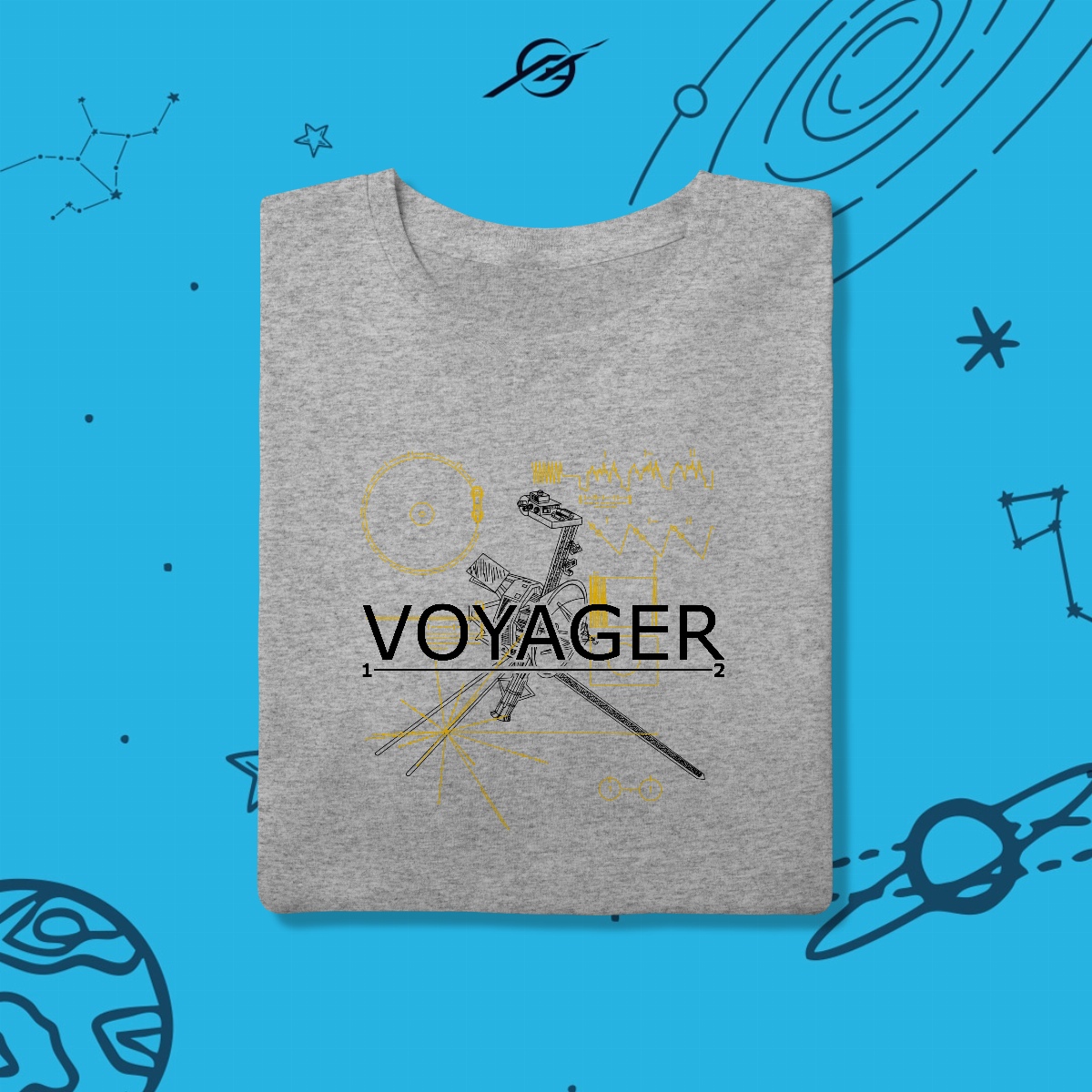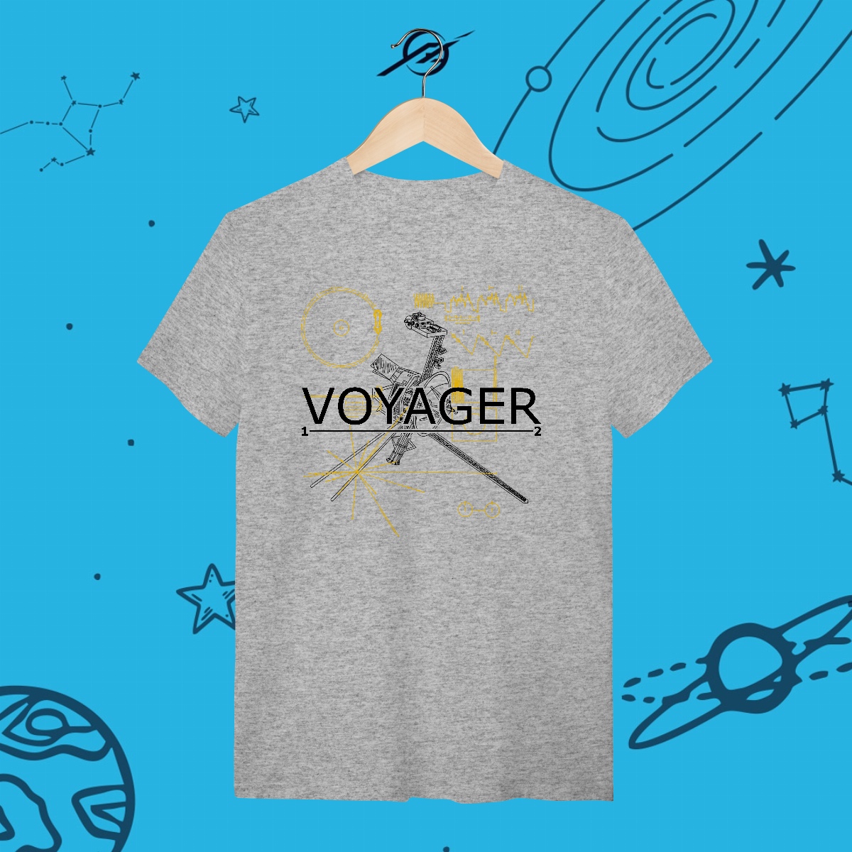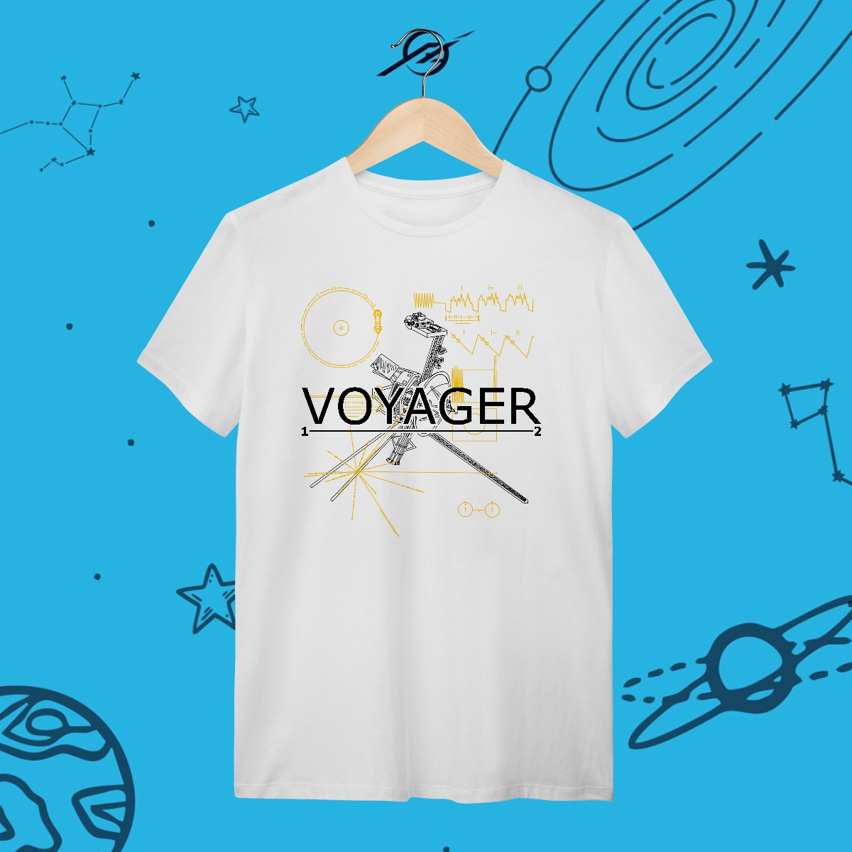 As sondas Voyager são mensageiras da humanidade, viajando além do Sistema Solar há mais de 40 anos. Levando consigo o Disco de Ouro, elas carregam nosso legado para o infinito. Esta estampa simboliza a busca pelo desconhecido, porque explorar é deixar nossa marca entre as estrelas.