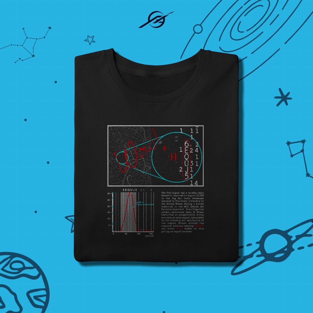 O "Sinal Wow!" é uma misteriosa transmissão de rádio captada em 1977, que permanece até hoje sem explicação. Talvez um eco distante de inteligência extraterrestre, ou apenas um fenômeno desconhecido. Esta estampa simboliza a busca por respostas, porque no "Wow!" do desconhecido, somos lembrados de que o universo está cheio de sinais esperando para serem decifrados.