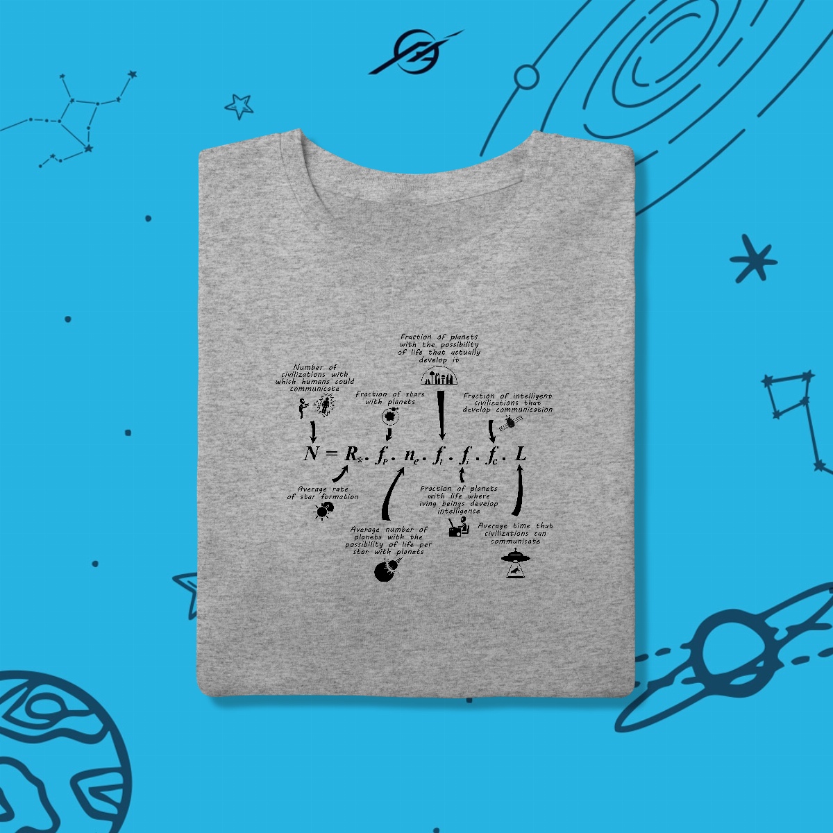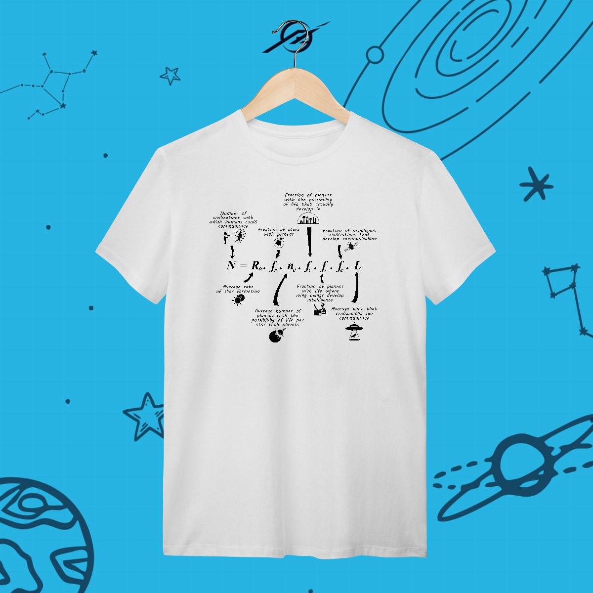 A Equação de Drake busca estimar o número de civilizações inteligentes em nossa galáxia, combinando probabilidades cósmicas com nossa curiosidade infinita. Mais do que um cálculo, ela nos faz questionar: estamos sozinhos no universo? Esta estampa simboliza a busca por vida além da Terra, porque explorar é também procurar por outras vozes entre as estrelas.