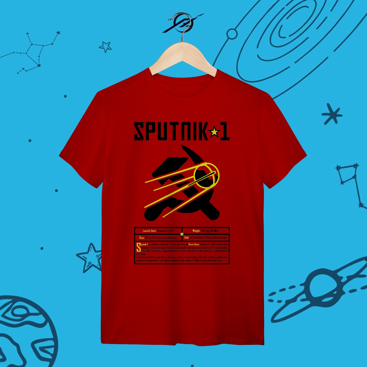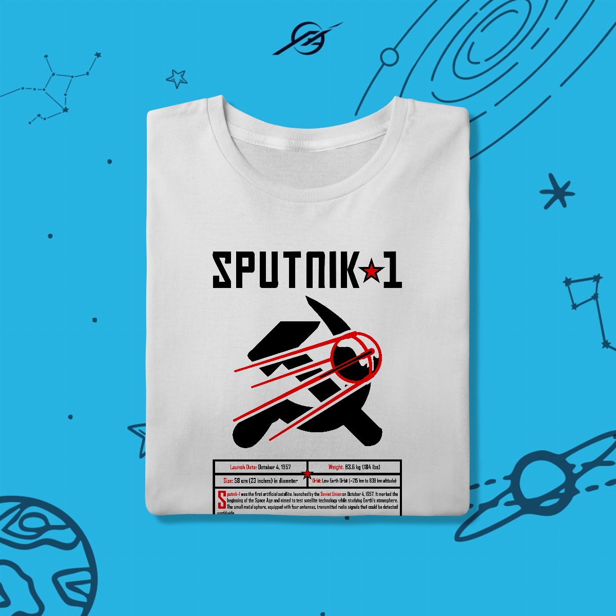 Em 1957, o Sputnik 1 marcou o início da era espacial, sendo o primeiro satélite artificial a orbitar a Terra. Seu sinal simples, um "bip" vindo do espaço, ecoou como um marco da engenhosidade humana. Esta estampa simboliza o começo de nossa jornada rumo às estrelas, porque toda grande exploração começa com um primeiro passo – ou um primeiro sinal.