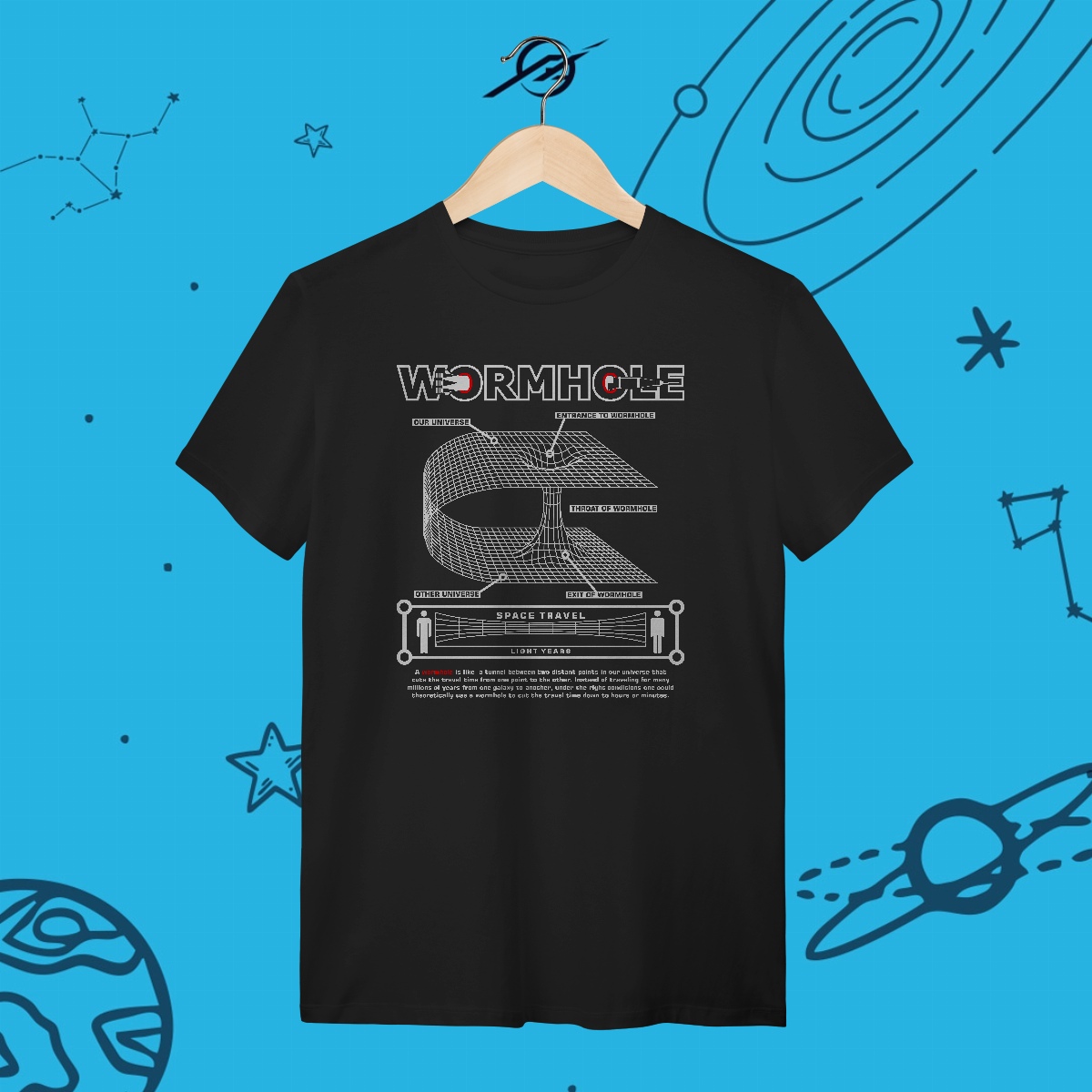 Os buracos de minhoca são passagens teóricas que conectam pontos distantes do universo, dobrando o espaço e o tempo em um atalho cósmico. Se existem ou não, ainda é um mistério, mas sua possibilidade nos inspira a imaginar novas formas de viajar entre as estrelas. Esta estampa simboliza a busca por caminhos além do óbvio, porque a exploração verdadeira rompe barreiras e desafia o impossível.