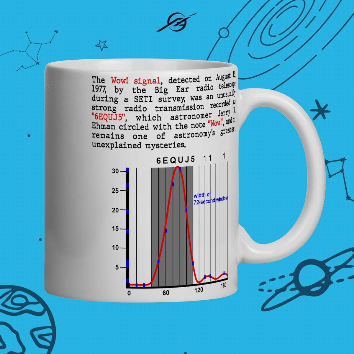 O "Sinal Wow!" é uma misteriosa transmissão de rádio captada em 1977, que permanece até hoje sem explicação. Talvez um eco distante de inteligência extraterrestre, ou apenas um fenômeno desconhecido. Esta estampa simboliza a busca por respostas, porque no "Wow!" do desconhecido, somos lembrados de que o universo está cheio de sinais esperando para serem decifrados.