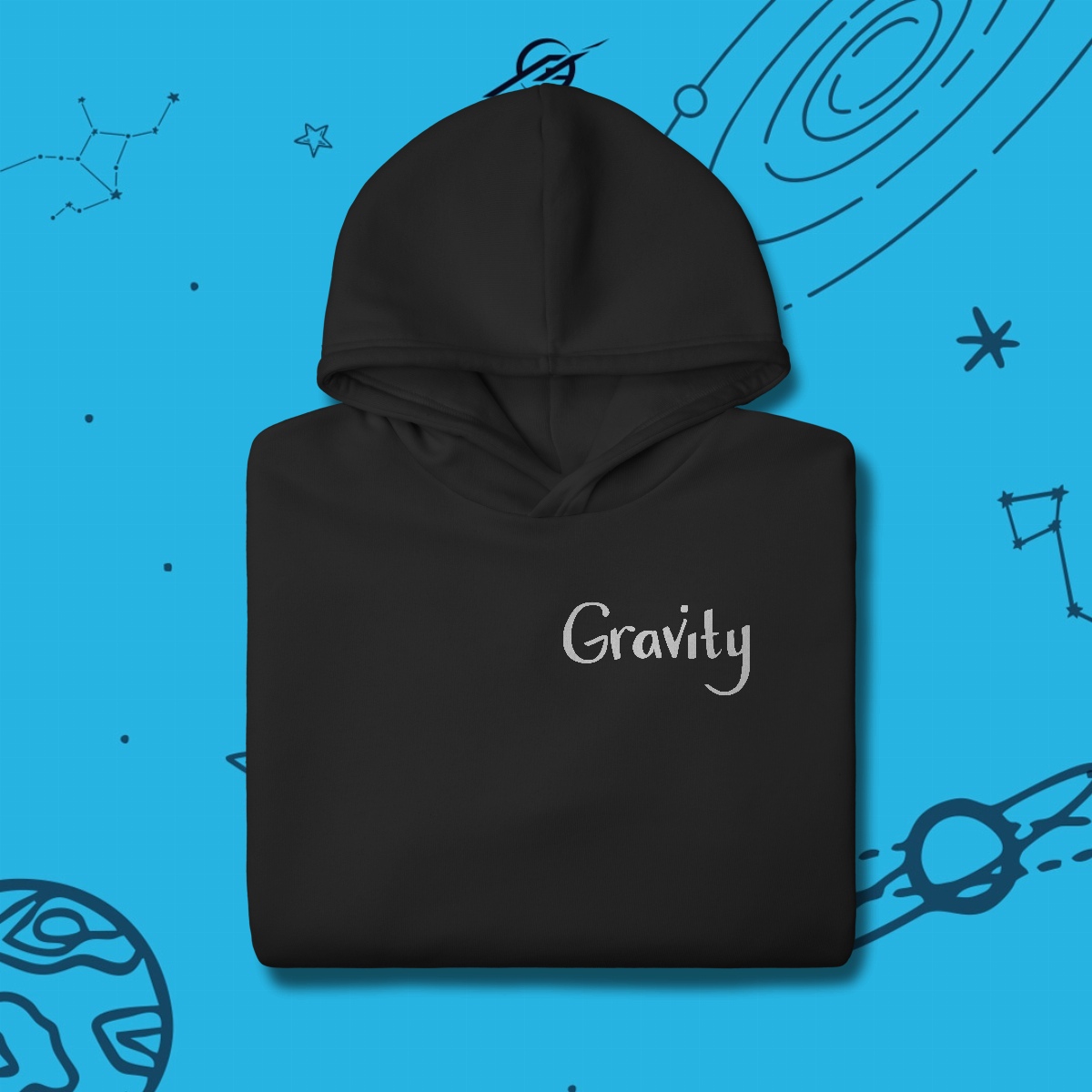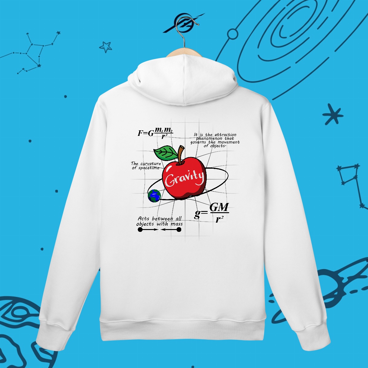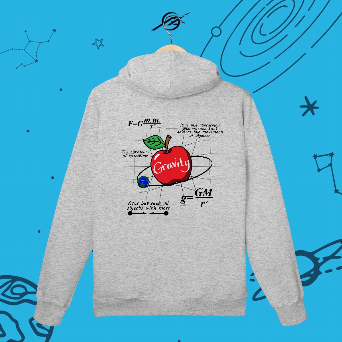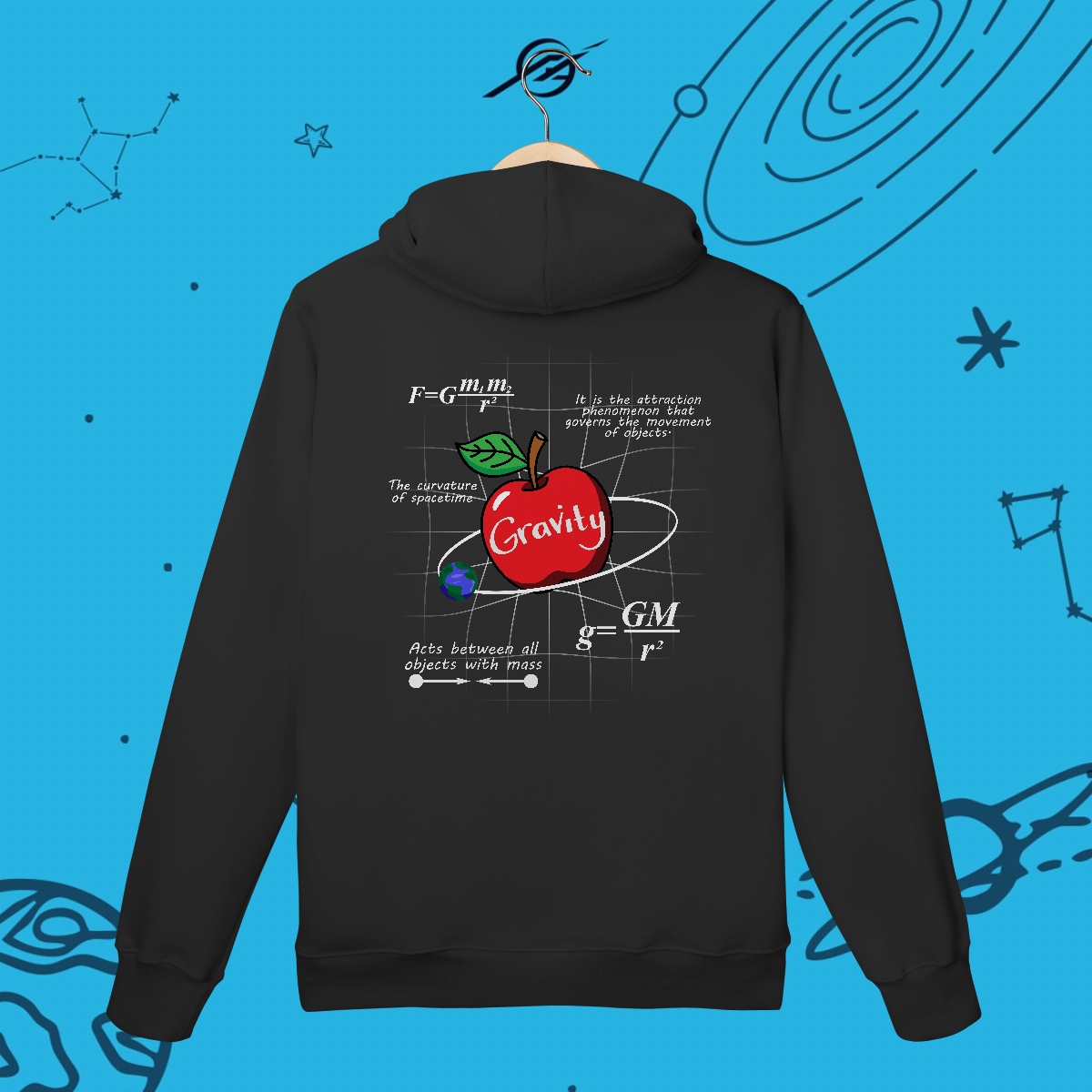 A gravidade é a força invisível que mantém planetas em órbita, forma galáxias e guia o próprio tecido do universo. Foi ela que levou Newton a uma grande descoberta e Einstein a reescrever as regras do cosmos. Esta estampa simboliza essa força que nos mantém firmes, mas também nos impulsiona a desafiar os limites e explorar o desconhecido.