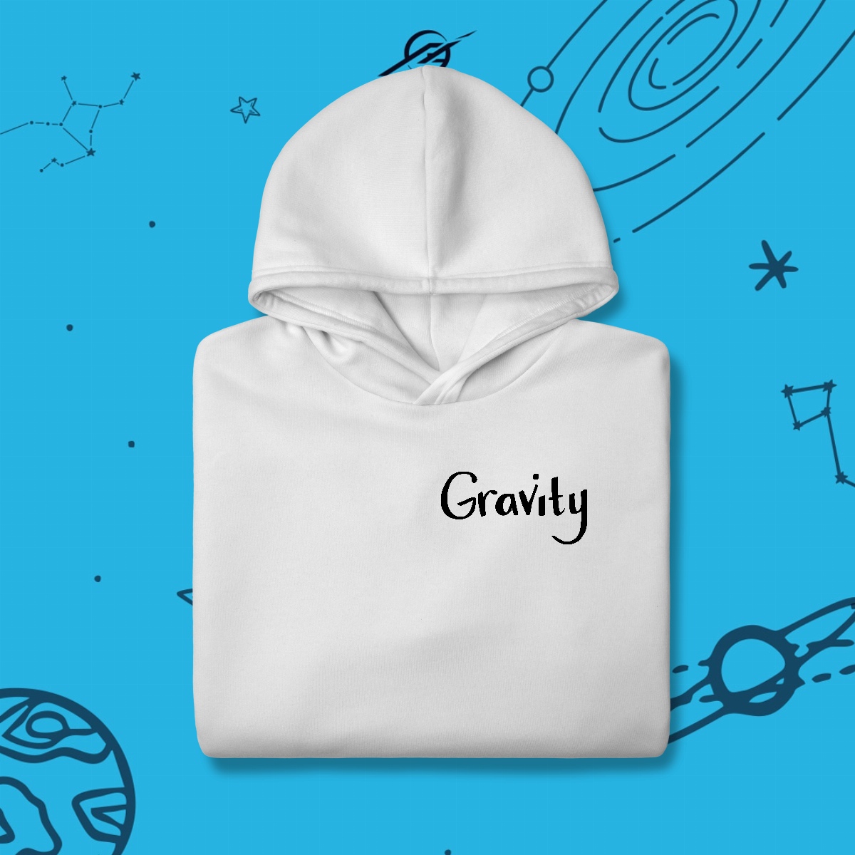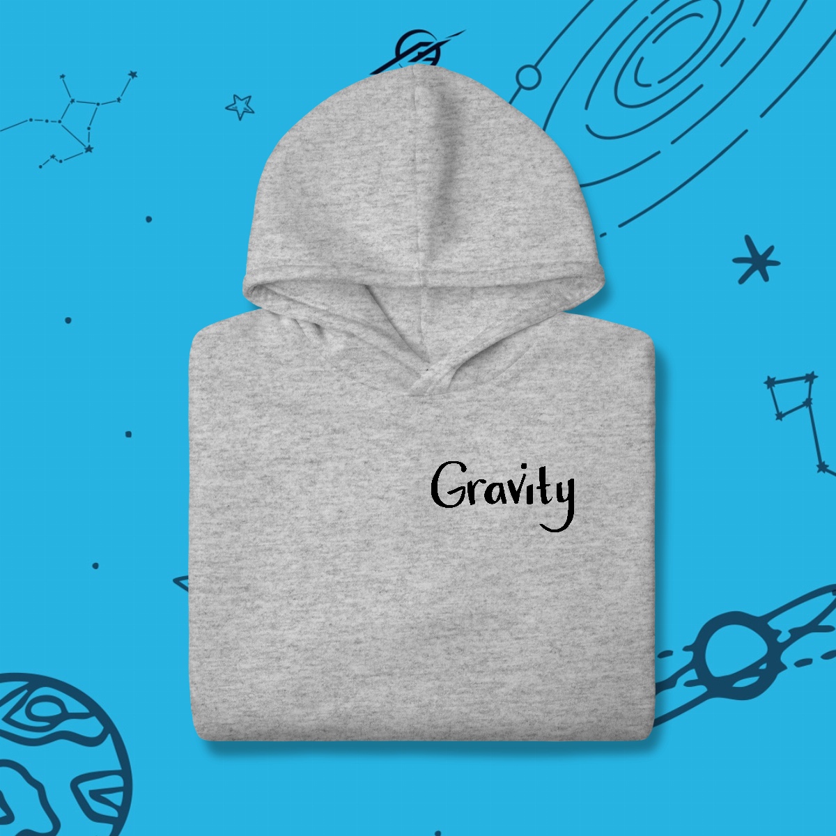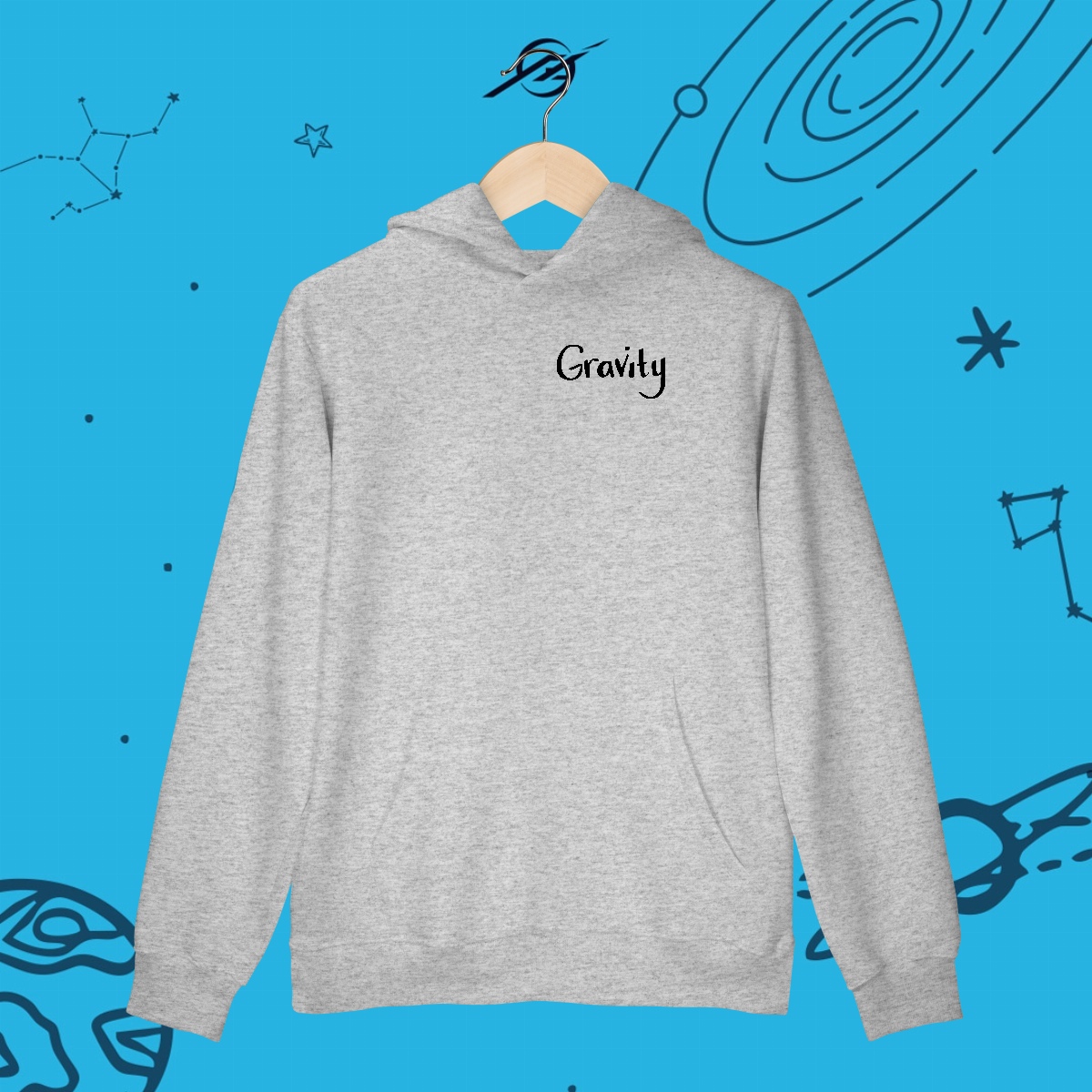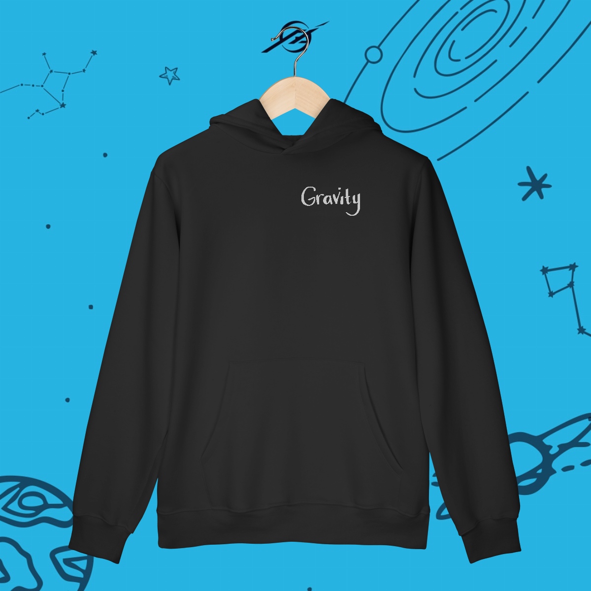 A gravidade é a força invisível que mantém planetas em órbita, forma galáxias e guia o próprio tecido do universo. Foi ela que levou Newton a uma grande descoberta e Einstein a reescrever as regras do cosmos. Esta estampa simboliza essa força que nos mantém firmes, mas também nos impulsiona a desafiar os limites e explorar o desconhecido.